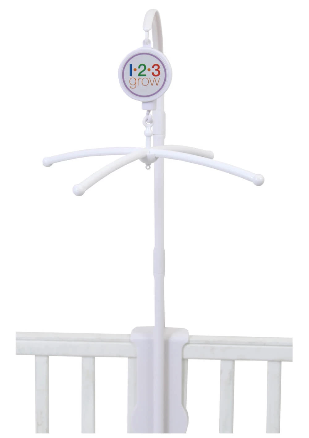 Back by popular demand – The Mobile Arch with Music Box. Now features improved cot clamp, longer/greater arch and heavier gage material. The product now includes optional cross support arms to allow you to be able to hang your own soft toys directly on, without the need for a separate “mobile”. Wind up music box plays a soothing lullaby.