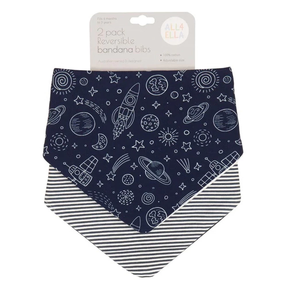 The Outer Space bandana bib is perfect for mealtimes or a stylish everyday bib. Made with 100% cotton, the bibs are designed to compliment any outfit whilst being absorbent to catch all those dribbles.