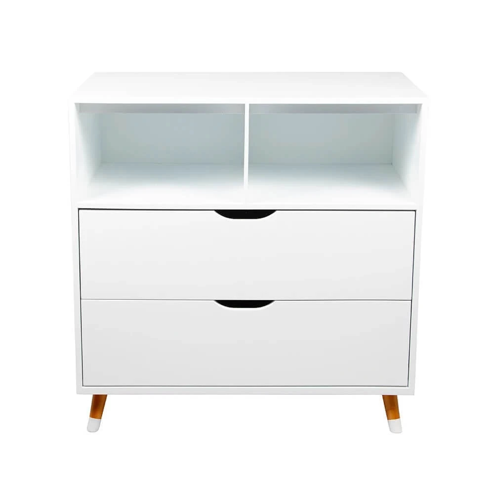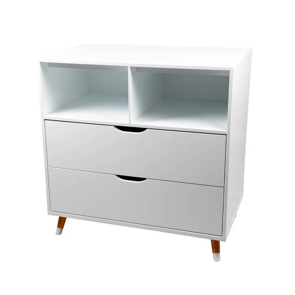 It includes two open shelves and two drawers perfect for placing diapers or baskets filled with toys.