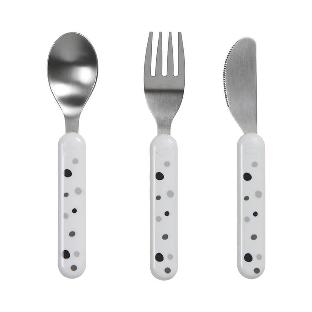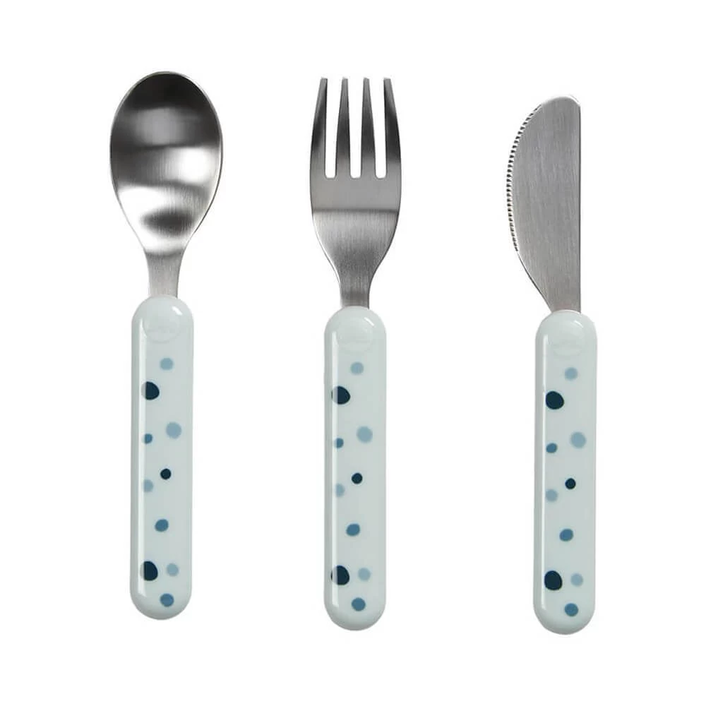 Practical cutlery set with a spoon, knife and fork for little eaters learning to eat on their own.