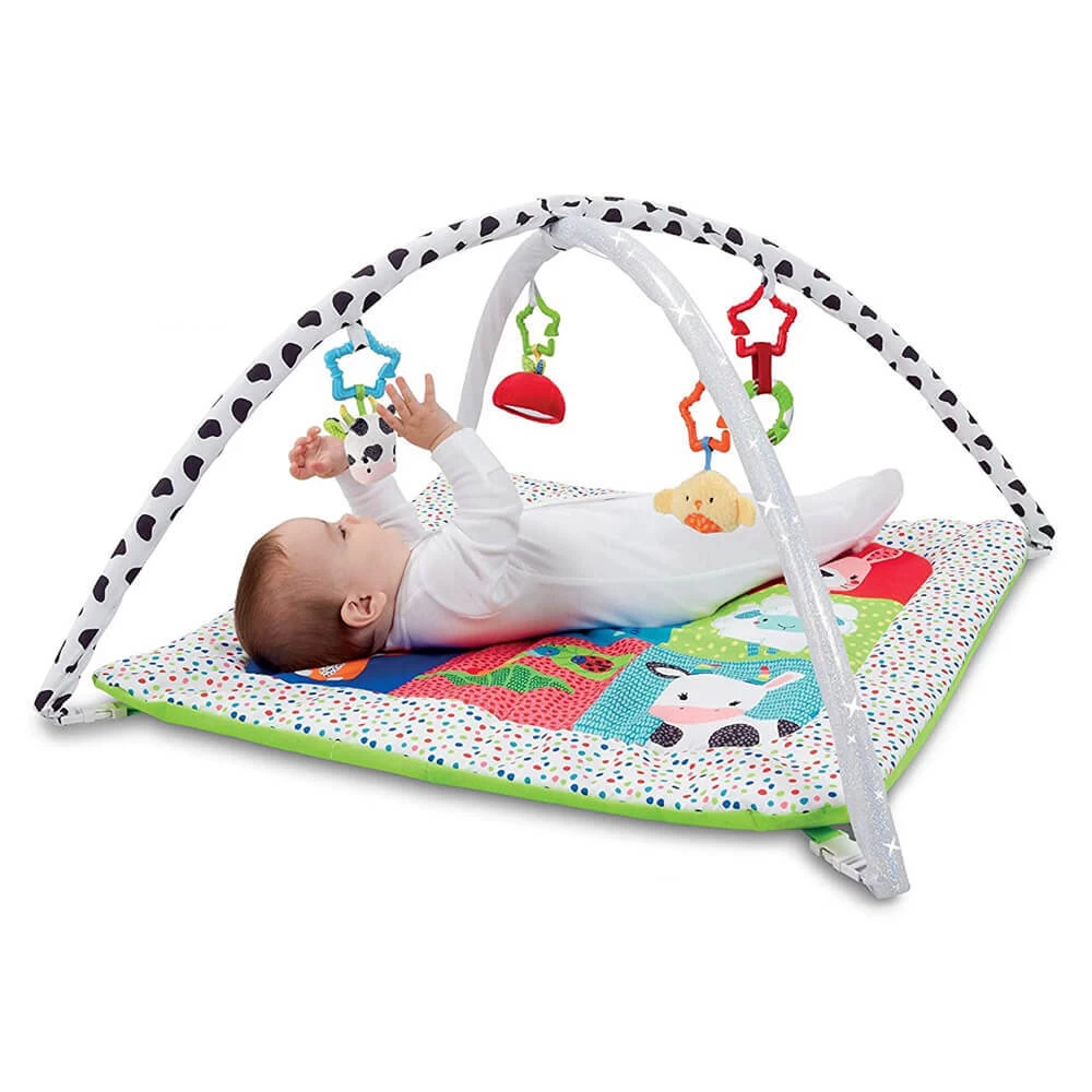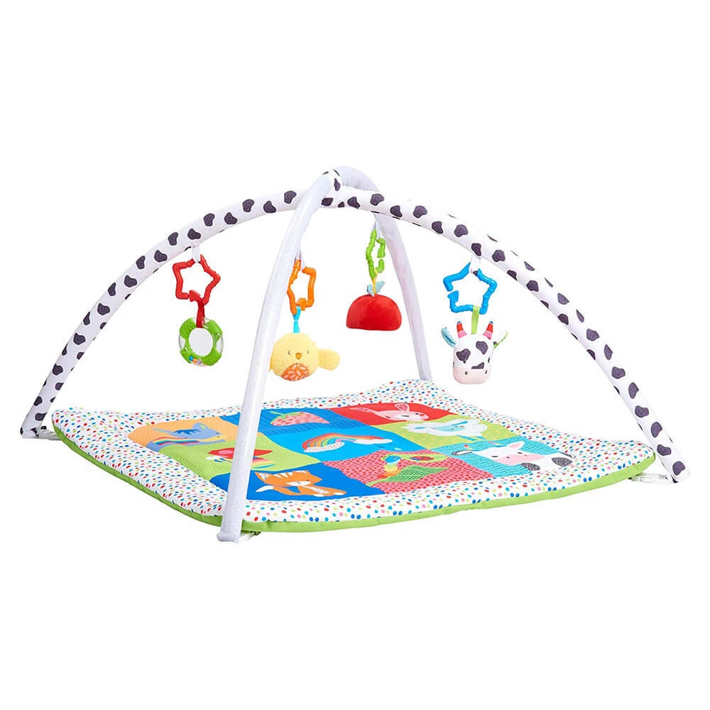 This extra-soft padded mat features a sensory arch with four detachable toys.