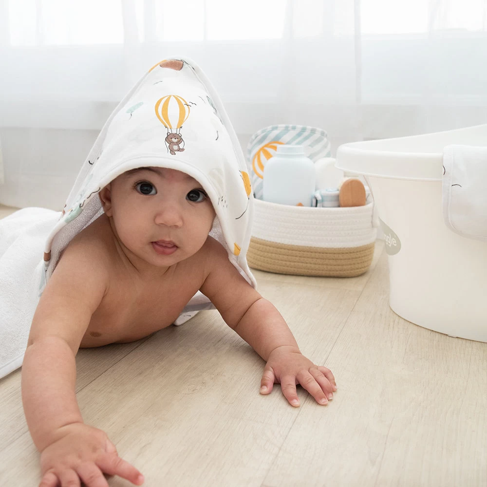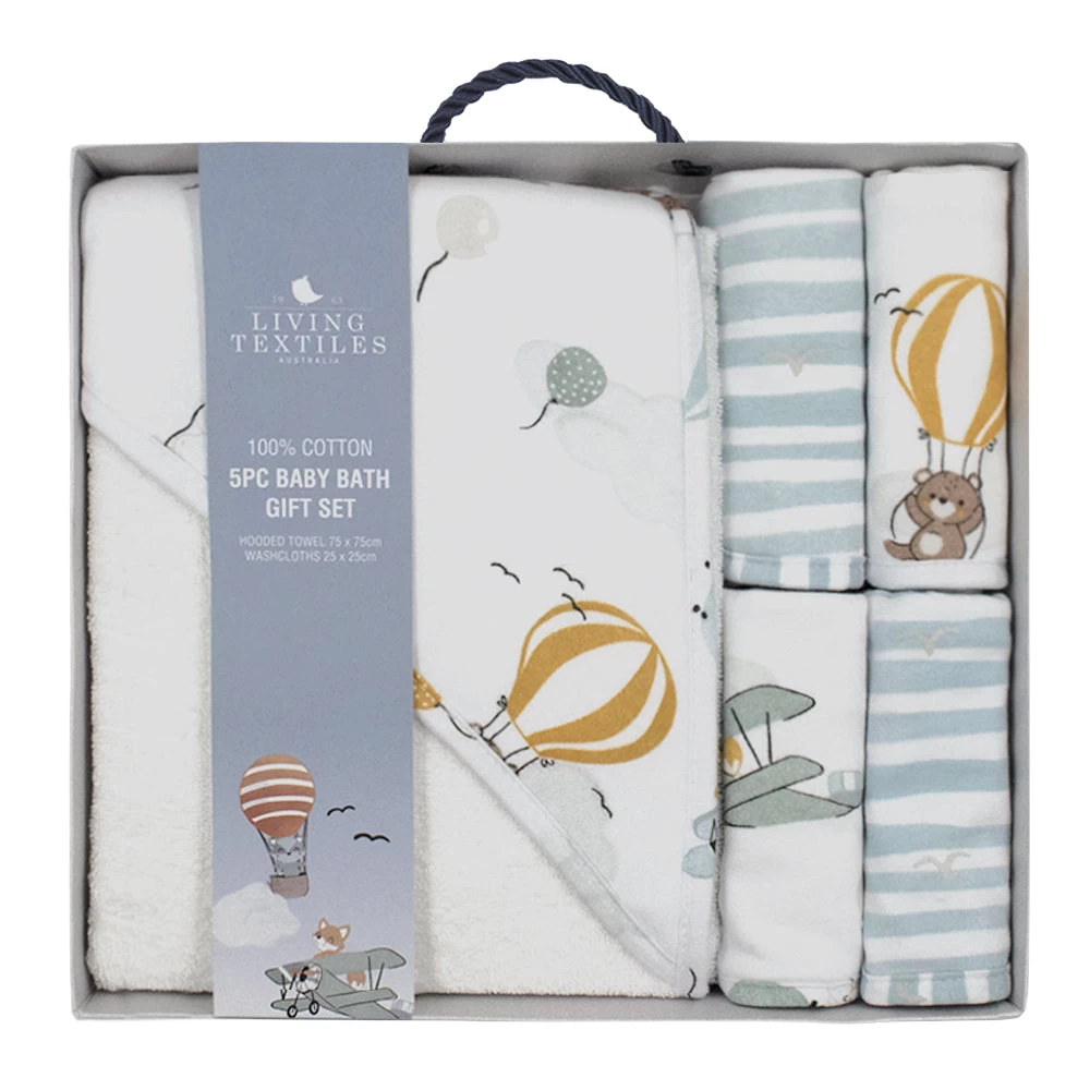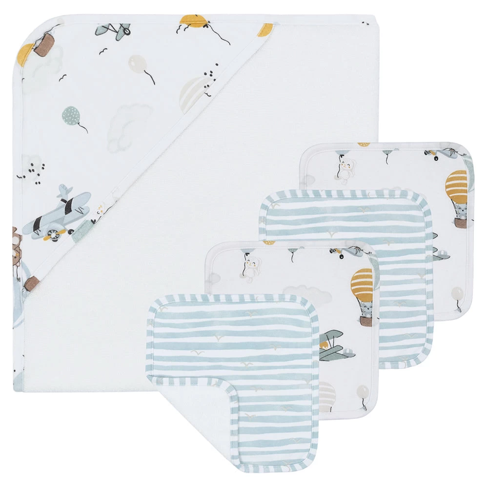 Add a touch of luxury to baby’s bath time with this gorgeous 100% cotton 5-piece baby bath set featuring a hooded towel and four washcloths.