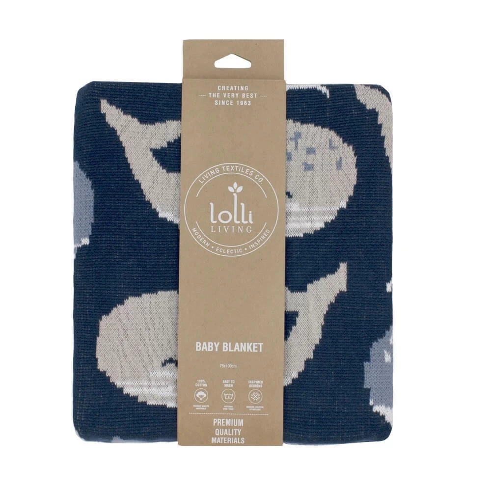 Versatile and light weight, this fun 100% cotton knit blanket features a contrasting happy whale design in navy blue and beige, that little ones are sure to love.