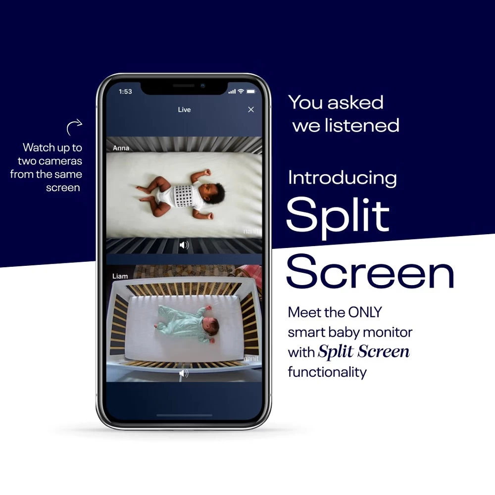- The only smart monitor with a Split Screen feature that allows users to see + control two cameras simultaneously in app