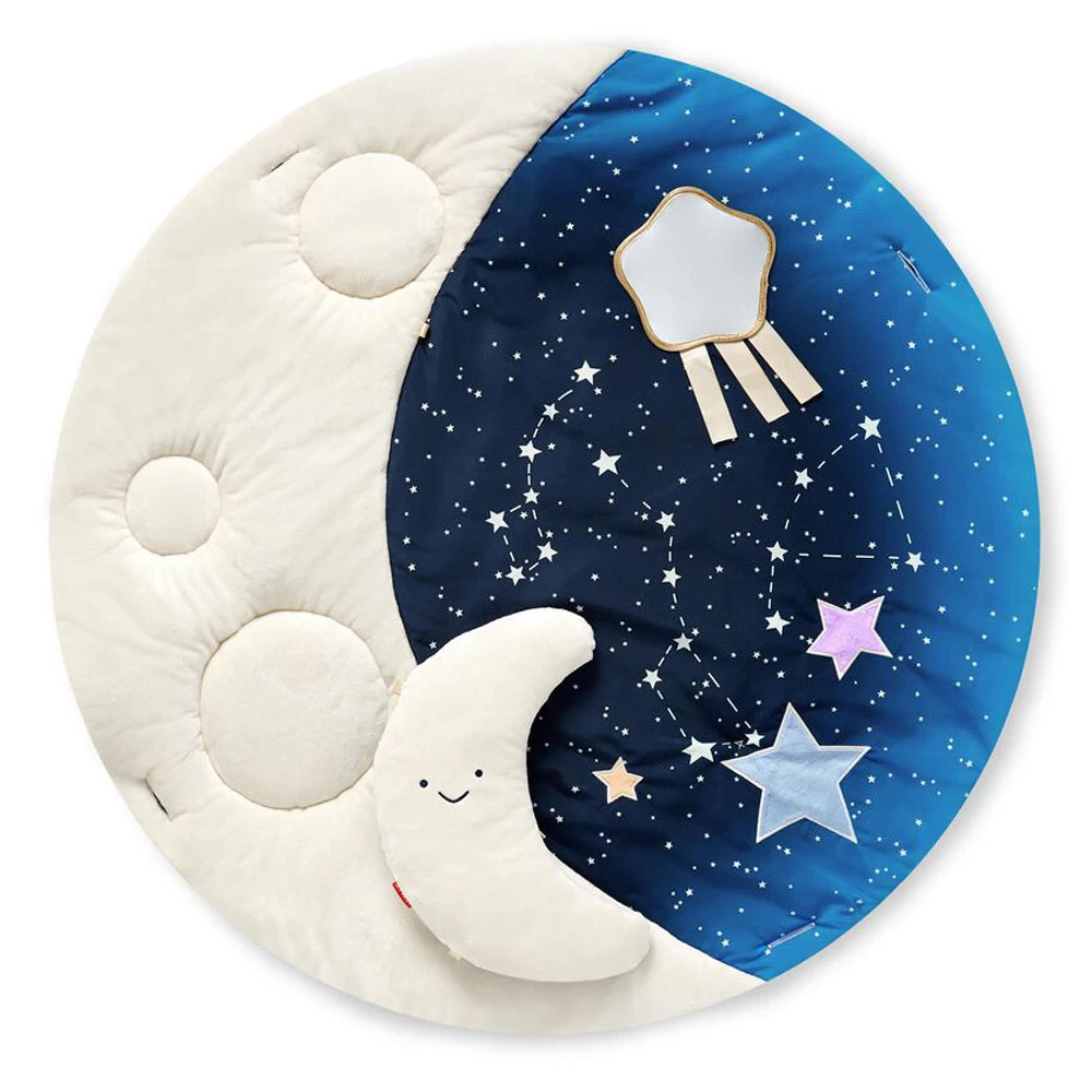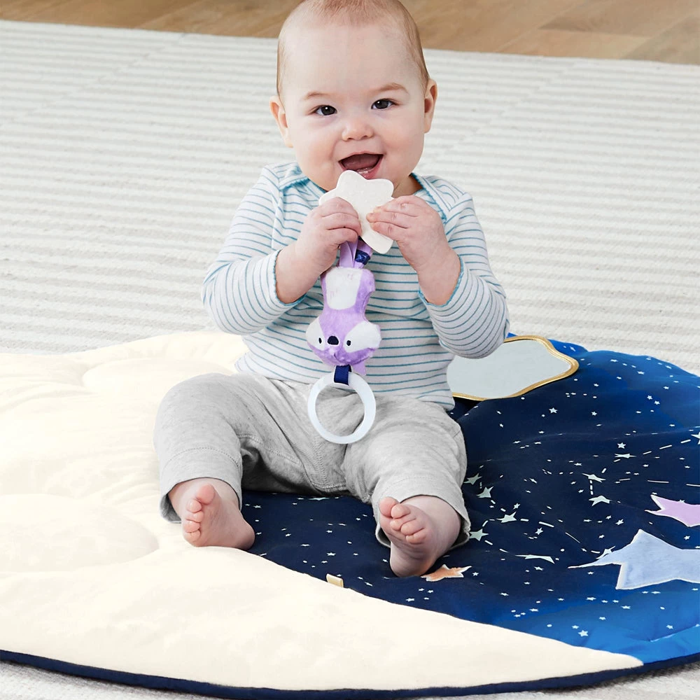 Packed with a galaxy of fun for baby, this dreamy activity gym features a celestial-themed playmat with plush quilting details and a crescent moon pillow for tummy time play. A removable shooting star baby mirror encourages self-recognition, while five nocturnal friends engage your little one’s senses with music, sounds, textures and more to explore.