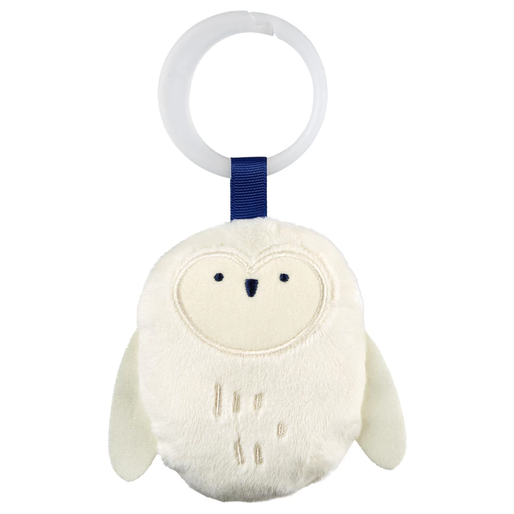 - 5 hanging toys include: Metallic musical star with tactile ribbons, Sugar glider lovey, Rattle raccoon with star teether toy, Wolf with chime, Snow owl with crinkle